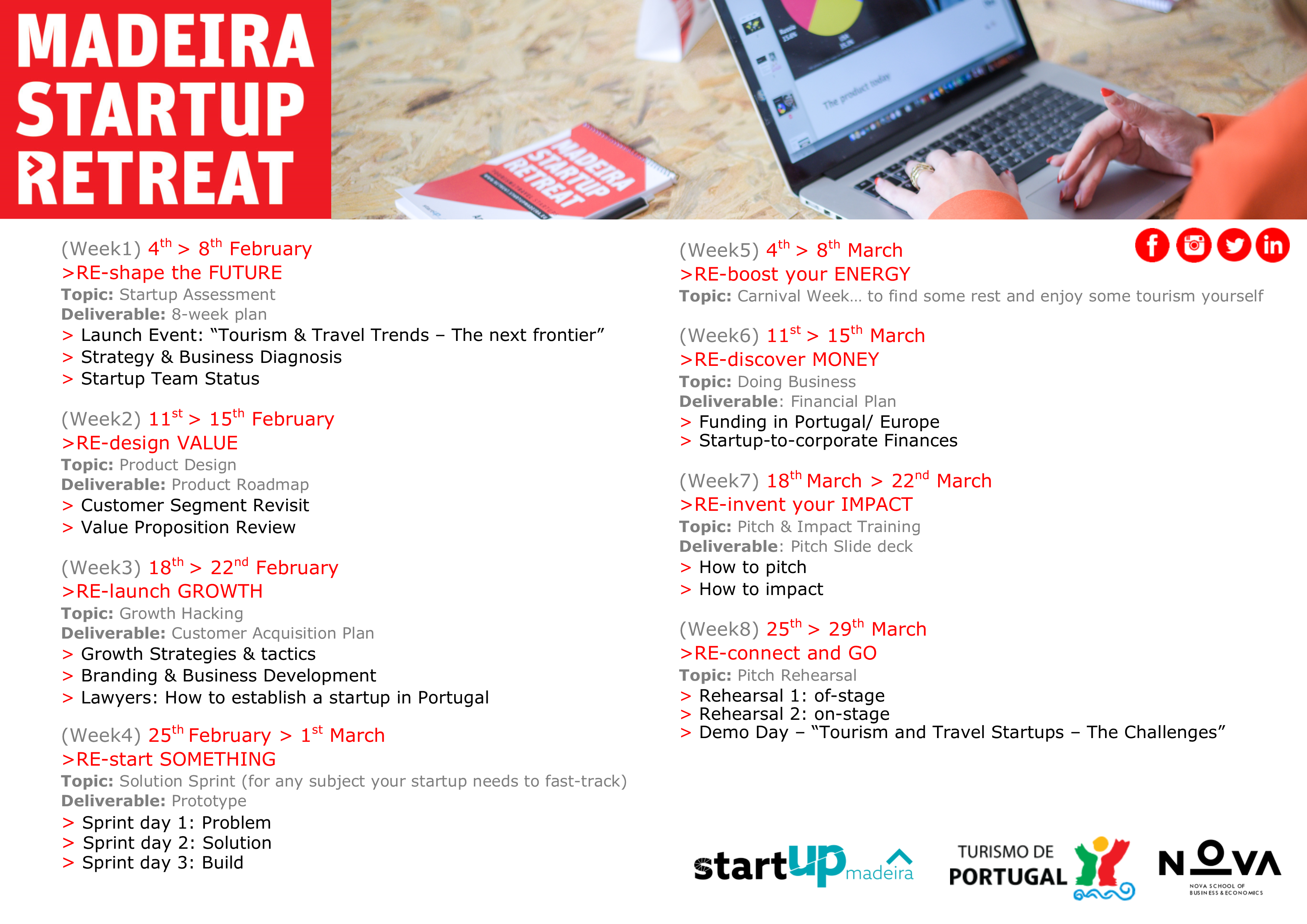Over a period of 8 weeks, the startups will be analyzed and new ideas or suggestions will be applied to their companies, products, and markets. It’s really important to each startup have 2 to 4 team members @ Madeira Startup Retreat, during the length of the program.